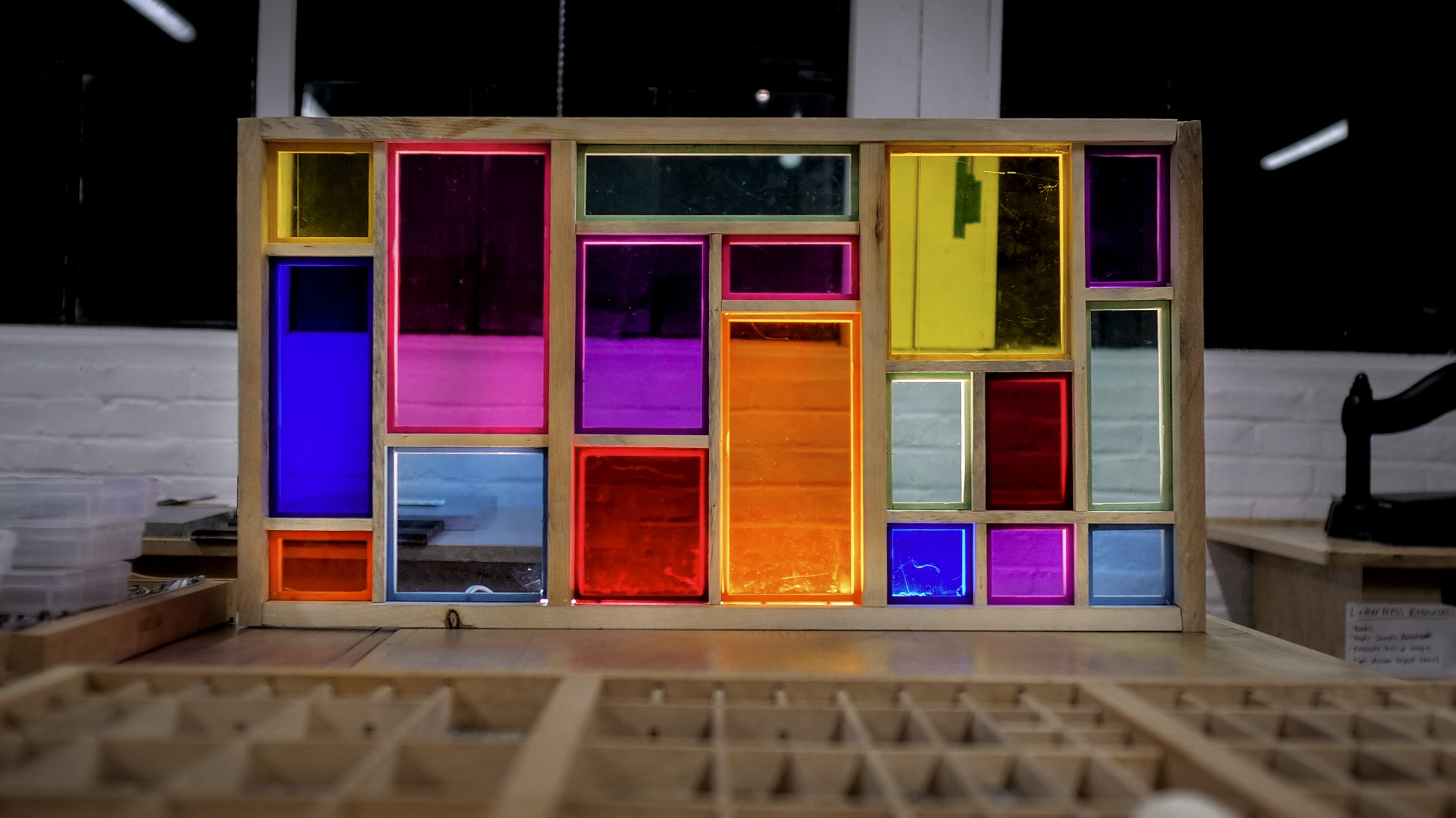 jujubot, 2025. Plaster and acrylic paint, 12″ x 24″. jujubot (process), 2025. Plaster and acrylic paint, 12″ x 24″. I AM ENDLESS (california job case), 2025. Pine and acrylic panels, 32″ x 16″. I AM ENDLESS (california job case), 2025. Pine and acrylic panels, 32″ x 16″.